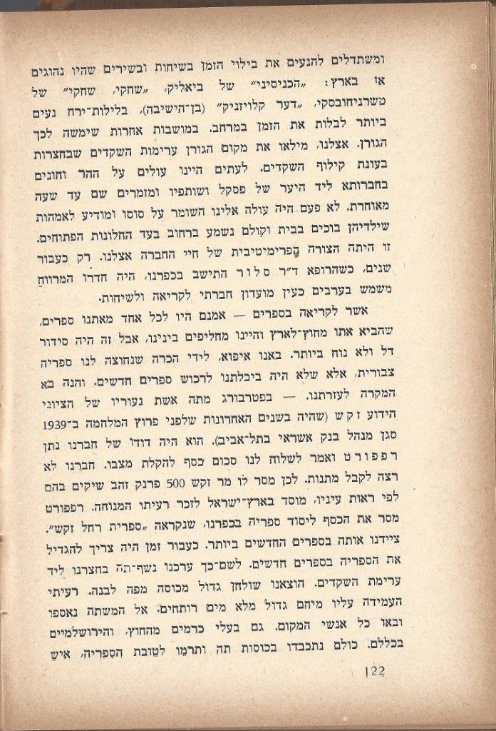 ומשתדלים להנעים את בילוי הזמן בשיחות ובשירים שהיו נהוגים אז בארץ: ''הכניסיני'' של ביאליק, ''שחקי שחקי'' של טשרניחובסקי, דער קלויזניק'' (בן-הישיבה), בלילות-ירח נעים ביותר לבלות את הזמן במרחב. במושבות אחרות שימשה לכך הגורן. אצלנו, מילאו את את מקום הגורן ערימות השקדים שבחצרות בעונת קילןף השקדים. לעתים היינו עולים על ההר והונים בחברותא ליד היער של פסקל ושותפיו ומזמרים שם עד שעה מאוחרת. לא פעם היה עולה אלינו השומר על סוסו ומודיע לאמהות שילדיהן בוכים בבית וקולם נשמע ברחוב בעד החלונות הפתוחים. זו היתה הצורה הפרימיטיבית של חיי החברה אצלנו. רק כעבור שנים, כשהרופא ד''ר סלור התישב בכפרנו, היה חדרו המרווח משמש בערבים כעין מועדון חברתי לקריאה ולשיחות. אשר לקריאה בספרים - אמנם היו לכל אחד מאתנו ספרים, שהביא אתו מחוץ-לארץ והיינו מחליפים בינינו, אבל זה היה סידור דל ולא נוח ביותר. באנו איפוא, לידי הכרה שנחוצה לנו ספריה צבורית, אלא שלא היה ביכלתנו לרכוש ספרים חדשים. והנה בא המקרה לעזרתנו. - בפטרבורג מתה אשת נעוריו של הציוני הידוע זקש (שהיה בשנים האחרונות שלפני פרוץ המלחמה ב-1939 סגן מנהל בנק אשראי בתל-אביב). הוא היה דודו של חברנו נתן רפפורט ואמר לשלוח לנו סכום כסף להקלת מצבו. חברנו לא רצה לקבל מתנות. לכן מסר לו מר זקש 500 פרנק זהב שיקים בהם לפי ראות עיניו, מוסד בארץ-ישראל לזכר רעיתו המנוחה. רפפורט מסר את הכסף ליסוד ספריה בכפרנו, שנקרא ''ספרית רחל זקש''. ציידנו אותה בספרים החדשים. לשם-כך ערכנו נשף-תה בחצרנו ליד ערימת השקדים. הוצאנו שולחן גדול מכוסה מפה לבנה. רעיתי העמידה עליו מיחם גדול מלא מים רותחים. אל המשתה נאספו ובאו כל אנשי המקום. גם בעלי כרמים מהחוץ, והירושלמיים בכללם. כולם נתכבדו בכוסות תה ותרמו לטובת הספריה, איש