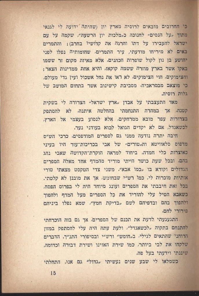 כי החרובים מובאים לרוסיה מארץ יון (שהיתה ידועה לי לגנאי מתוך ''על הנסים'' לחנוכה כ''מלכות יון הרשעה'', שקמה על עם ישראל להעבירו על דתו והרגה את קדושיו בחרב): והתמרים באים לא מיריחו מודעת, עיר התמרים, שחומותיה נפלו לפני יהושע בן נון לקול שופרות הכהנים, אלא מאיזה מקוםזר ששמו באקו אשר בארץ מוזרה ששמה קוקאז, והיא אחת ממדינות הצאר: והצימוקים , הוי הצימוקים, לא ראו את נחל אשכול ועין גדי מעולם, כי מוצאם מבסראביה, מסביבת קישינוב אשר בתחום המושב של גלות רוסיה. בצרורות עפר מובא ממרחקים, מאד התעצבתי על אבדן ''ארץ ישראל'' הצרורה לי בשקית קטנה, אך במהרה התנחמתי בהחלטה איתנה, לא להסתפק בצרורות עפר מובא ממרחקים, אלאלנסוע בעצמי אל הארץ, לכשאגדל, אם לא יקדים הגואל לבוא בעודני נער. חיבה יתרה נודעה ממני גם לספרים המודפסים. כרכי הש''ס מדפוס סלאוויטא וה''טורים'' של אבי בכריכות-עור היו בעיני כאוצרות כלי חמדה, ביחוד למראה הוקרת-הקדושה שאבי נהג בהם, ובכל שעת כושר הייתי מוריד מהמדף אחד מאלה הספרים הגדולים וקורא בו ''כמו אבא''. משני צדי הטקסט מצאתי טורי אותיות מוכרות לי, כמו רש''י שבחומש, אך את מובנן לא קלטתי. בכל זאת חיבבתי את הספרים ועונג מיוחד היה לי בפרוס הפסח, כשאבא הטיל עלי להוריד את כל הספרים מעל המדף ולהפוך ולהפוך בהם ובדפיהם לשם ''בדיקת חמץ'', שמא נפלו ביניהם פירורי לחם. התגעגעתי לדעת את תכנם של הספרים, אך גם בזה הןכרחתי להתנחם בתקוה ''לכשאגדל''. ולעת עתה היה עלי להסתפקר במזון הרוחני שהתאים לגילי ב''חומש'' ורש''י ובסיפרי התנ''ך. הדברים שלקחו את לבי ביותר, כמו שירת האזינו ושירת דבורה וכדומה, שיננתי וידעתי בעל פה. כשמלאו לי שבע שנים נעשיתי ''גדול''' גם אני. התחלתי 15