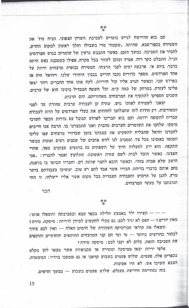 עם בוא הדרישה לגייס נוטרים לסביבת השרון הצפוני, הניח מיד את השמירה בכפר-סבא, שהיתה ''שקטה'' מדי בשבילו והלך ראשון למקום חדש, להכיר את הסביבה. במשך הזמן, כאשר התגבש גרעין של שומרים בגוש הפרדסים הנ''ל, התבלט כקר רוח, אמיץ ומוכן לעזור בכל מקרה, אפילו כשסכנת נפש היה בדבר. ביום א', ארבעה ימים לפני הרצחו, המטירה כנופית מרצחים יריות על אחד הפרדסים. מספר כדורים נקבו חורים בבנין היחידי שלנו. ויחיאל היה אז בפרדס שני, וכאשר הגיע אליו קול היריות, לקח אתו אחד החברים ויחד יצאו אלינו לעזרה, במרחק של כמה ק''מ, וכל השטח המבדיל בינינו הוא של ערבים. השנים הספיקו להתקיף את המרצחים מאחוריהם, והם הרבים. יצאנו לשמירה לאותו גוש, שהיה קן לעבודה ערבית טהורה עד לפני המאורעות, רק הודות לזה שהצלחנו להחתים את בעלי הפרדסים על חוזה לעבודה עברית לתקופה ידועה. ועם בא חברינו לפרדס הגובל עם גדרות הכפר הערבי מיסקי, שלחנו את השומרים הערבים מהבית ואנו התבצרנו בו. הרבה אנו חייבים לחברנו יחיאל שהצליח להשקיט את עצבינו בזמן שכדורי מרצחים עפו עלינו וזמזמו באזנינו מכל צד, ומסביב לנו לחש פתנים של שכנים רעים ואתות מבשר התקפה. הוא ידע להעלות חיוך על השפתים גם ברגעים עצובים מאד. אחרי הפצעו, כאשר הובל לבית לשם עזרה ראשונה, התלוצץ ואמר לחבריו: ''אני חושב שלא אמות מזה''. וכאשר הובא לחצר שותת דם, וחבריו הביטו בו דאגה, נחם אותם בדברי בדיחה. חבריו אשר אבד להם רע טוב, ימשיכו בעבודתם ביתר מרץ, להגן על הרכוש והעבודה העברית בכל מקום אשר אליו יישלחו. זו תהי תגובתנו על מעשי המרצחים. חבר - - - תעירו ילד באמצע הלילה בכפר סבא ובסביבתה ותשאלו אותו: מאין יורים? - האם לא יגיד לכם, להקשיב לכיוון היריות: מיסקה, טירה? תשאלי את קוראי הכרוניקה השחורה של הימים האלה - ואין לכם צורך לבחור בחרוצים ביותר - מי ומי הם קני המרצחים התוקפים והחוזרים ותוקפים את הסכיבה הזאת, כלום לא יענו לכם: מיסקה טירה? אלפי יריות יצאו ממיסקה ומטירה או מכנופיות אשר מצאו להן מקלט בכפרים אלה. פעמים, שלוש פעמים בשבוע קראנו או גם שמענו ברדיו : המשטרה, הצבא השיבו אש, לא היו אסונות. בזה נסתיימה הידיעה, פעמים, שלוש פעמים בשבוע - במשך חדשים. 15