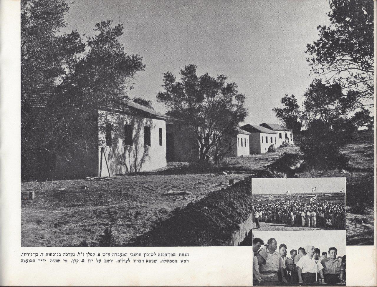 הנחת אבן הפינה לשיכון תושבי המעברה ע''ש א. קפלן ז''ל. נערכה בנוכחות ד. בן-גוריון, ראש הממשלה, שנשא דבריו לעולים. יושב על ידו א. קרן, מי שהיה יו''ר המועצה.