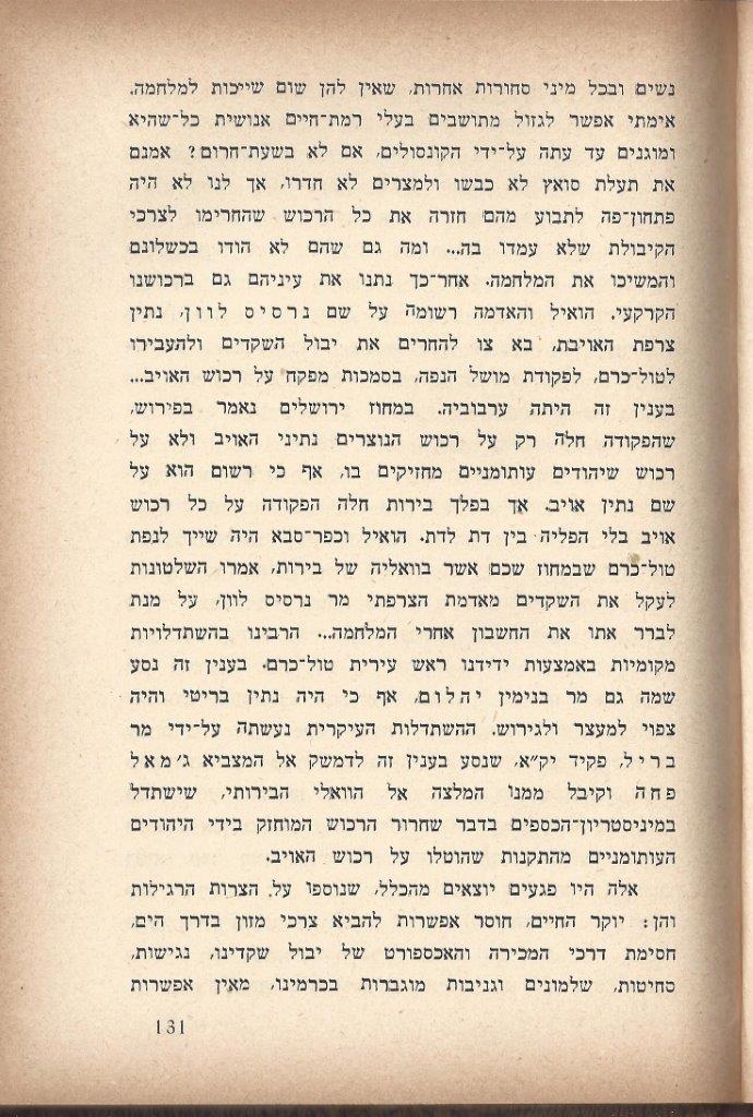 נשים ובכל מיני סחורות אחרות, שאין להן שום שייכות למלחמה. אימתי אפשר לגזול מתושבים בעלי רמת-חיים אנושית כל-שהיא ומוגנים עד עתה על-ידי הקונסולים, אם לא בשעת-חרום? אמנם את תעלת סואץ לא כבשם לא חדרו, אך לנו לא היה פתחון-פה לתבוע מהם חזרה את כל הרכוש שהחרימו לצרכי הקיבולת שלא עמדו בה... ומה גם שהם לא הודו בכשלונם והמשיכו את המלחמה. אחר-כך נתנו את עיניהם גם ברכושנו הקרקעי. הואיל והאדמה רשומה על שם נרסיס לוון, נתין צרפת האויבת, בא צו להחרים את יבול השקדים ולהעבירו לטול-כרם, לפקודת מושל הנפה, בסמכות מפקח על רכוש האויב...בענין זה היתה ערבוביה. במחוז ירושלים נאמר בפירוש, שהפקודה חלה רק על רכוש הנוצרים נתיני האויב ולא על רכוש שיהודים עותומניים מחזיקים בו, אף כי רשום הוא על שם נתין אויב. אך בפלך בירות חלה הפקודה על כל רכוש אויב בל הפליה בין דת לדת. הואיל וכפר-סבא היה שייך לנפת טול-כרם שבמחוז שכם אשר בוואליה של בירות, אמרו השלטונות לעקל את השקדים מאדמת הצרפתי מר נרסיס לוון, על מנת לברר אתו את החשבון אחרי המלחמה... . הרבינו בהשתדלויות מקומיות באמצעות ידידנו ראש עירית טול-כרם. בענין זה נסע שמה גם מר בנימין ימלום, אף כי היה נתין בריטי והיה צפוי למעצר ולגירוש. ההשתדלות העיקרית נעשתה על-ידי מר בריל, פקיד יק''א, שנסע בענין זה לדמשק אל המצביא ג'מאל פחה וקיבל ממנו המלצה אל הוואלי הבירותי, שישתדל במיניסטריון-הכספים בדבר שחרור הרכוש המוחזק בידי היהודים העותומניים מהתקנות שהוטלו על רכוש האויב. אלה היו פגעים יוצאים מהכלל, שנוספו על הצרות הרגילות והן: יוקר החיים,חוסר אפשרות להביא צרכי מזון בדרך הים, חסימת דרכי המכירה והאכספורט של יבול שקדינו, נגישות, סחיטות, שלמונים וגניבות מוגברות בכרמינו מאין אפשרות 131