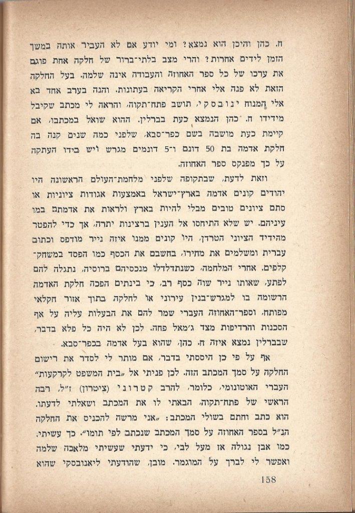 ח. כהן והיכן הוא נמצא? ומי יודע אם לא העביר אותו במשך הזמן לידים אחרות? והרי מצב בלתי-ברור של חלקה אחת פוגם את ערכו של כל ספר האחוזה והעבודה אינה שלמה. בעל החלקה הזאת לא פנה אלי אחרי הקריאה בעתונות. והנה בערב אחד בא אלי המנוח ינובסקי, תושב פתח-קוה, והראה לי מכתב שקיבל מידידו ח. כהן הנמצא כעת בברלין. ההוא שואל במכתבו, אם קיימת כעת מושבה בשם כפר-סבא, שלפני כמה שנים קנה בה חלקת אדמה בת 50 דונם ו-5 דונמים מגרש ויש בידו העתקה על כך מפנקס ספר האחוזה. וזאת לדעת,שבתקופה שלפני מלחמת-העולם הראשונה היו יהודים קונים אדמה בארץ-ישראל באמצעות אגודות ציוניות או סתם ציונים טובים מבלי להיות בארץ ולראות את אדמתם במו עיניהם. יש שלא יתיחסו אל הענין ברצינות יתרה, אך כדי להפטר מהידיד הציוני הטרדן, היו קונים ממנו איזה נייר מודפס וכתוב עברית ומשלמים את מחירו, בחשבם את הכסף כמו הפסד במשק-קלפים. אחרי המלחמה, כשנתדלדלו מנכסיהם ברוסיה, נתגלה להם לפתע, שאותו נייר שוה כסף רב. כי בינתים הפכה חלקת האדמה הרשומה בו למגרש-בנין עירוני או לחלקה בתוך אזור חקלאי מפותח, וספר-האחוזה העברי שמר להם את הבעלות עליה על אף הסכנות והרדיפות מצד ג'מאל פחה. לכן לא היה כל פלא בדבר, שבברלין נמצא איזה ח. כהן, שהוא בעל אדמה בכפר-סבא. אף עך פי כן היססתי בדבר, אם מותר לי לסדר את רישום החלקה על סמך המכתב הזה. לכן פניתי אל ''בית המשפט לקרקעות'' העברי האוטונומי, כלומר, להרב קטרוני (ציטרון) ז''ל, רבה הראשי של פתח-תקוה, הבאתי לו את המכתב ושאלתי לדעתו. הוא כתב וחתם בשולי המכתב: ''אני מרשה להכניס את החלקה הנ''ל בספר האחוזה על סמך המכתב שנכתב לפי תומו''. כך עשיתי. כמו אבן נגולה אז מעל לבי כי ידעתי שעשיתי מלאכה שלמה ואפשר לי לברך על המוגמר. מובן, שהודעתי ליאנובסקי שהוא 158