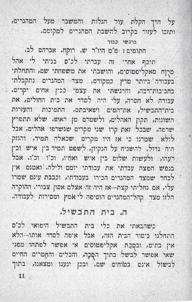 על דרך הקלת עול הגלות והמשבר מעל המהגרים, ותזכו לעזור בקרוב להשבת המהגרים למקומם. ברגשי כבוד חתומים: מ''מ היו''ר ש. רורח. אברהם לב. תיכף אחרי זה עברתי לכ''ס בניתי לי אהל מרווח מאקליפטוסים, והושבתי את משפחתי שם, והתחלתי בעבודה ביותר מרץ כמקודם. מצד המהגרים נתקבלתי בחביבות-רבה, והרגשתי את עצמי כבין אחים יקרים. עבודה לא חסרה, עלי היה לסדר את בית החולים, את בית התבשיל, את-המים ושאיבתם, התמיכות והעזרות השונות, תקון האהלים, ולשמרם מן האש, שלא תתפרץ שרפה, שבכל זאת קרו שני מקרים שנשרפו אהלים. אבל לולא שמרנו כי אז היו מקרים שכאלה תמיד, והנזק היה גדול, להשגיח על הנקיון, לשפט תמיד בין איש ובין רעהו, ולעשות שלום בין איש ואחיו, וכ''ו וכ''ו. אבל בנפש חפצה עבדתי את עבודתי יומם ולילה. ואמנם אין לכחד שמצד המהגרים הכירו בעבודתי, וכבבת עינם שמרו עלי, אם נחליתי קצת - אז היה זה אצלם אסון צבורי. ההוקרה הלזו מצד קהל-המהגרים הוסיפה לי אמץ ומסירות לעבודה. ה. בית התבשילכשהבאתי את כלי בית התבשיל היפואי לכ''ס התחלנו ביסוד הבית הזה, אבל איפה לסדר אותו - הלא אין בתים, ובסוכות אקליפטוסים אי אפשר לפתחו מפני שאי אפשר לבשל בתוך הסוכה, והכלים והחמרים החיים לבשול אינם בטוחים שם. ובכן יגענו ומצאנו, בתוך11