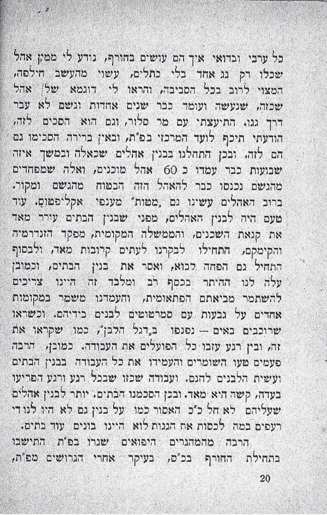 כל ערבי ובדואי איך הם עושים בחורף, נודע לי ממין אהל שכלו רק גג אחד בלי כתלים, עשוי מהעשב חילפה, המצוי לרוב בכל הסביבה, והראו לי דוגמא של אהל שכזה, שנעשה ועומד כבר שנים אחדות וגשם לא עבר דרך גגו. התיעצתי עם מר סלור, וגם הוא הסכים לזה, הודעתי תיכף לועד המרכזי בפ''ת, ובאין ברירה הסכימו גם הם לזה. ובכן התחלנו בבנין אהלים שכאלה ובמשך איזה שבועות כבר עמדו כ-60 אהל מוכנים, ואלה שמפחדים מהגשם נכנסו כבר להאהל הזה הבטוח מהגשם ומהקור. ברוב האהלים עשינו גם ''מטות'' מענפי אקליפטוסים. עוד טעם היה לבנין האהלים, מפני שבנין הבתים עורר מאד את קנאת השכנים, והממשלה המקומית, מפקד הז'נדרמיה והקימקם, התחילו לבקרנו לעתים קרובות מאד, ולבסוף התחיל גם הפחה לבוא, ואסר את בנין הבתים, וכמובן עלה לנו ההיתר בכסף רב ומלבד זה היינו צריכים להשתמר מביאתם הפתאומית, והעמדנו משמר במקומות אחדים על גבעות עם שמרטוטים לבנים בידיהם. וכשראו שרוכבים באים - נפנפו ב ''דגל לבן'', במו שקרו את זה, ובין רגע עזבו כל הפועלים את העבודה. כמובן, הרבה פעמים טעו השומרים והעמידו את כל עבודה בבנין הבתים ועשית לבנים לחנם. ועבודה שכזו שבכל רגע ורגע הפריעו בעדה, קשה היא מאד. ובכן הסכמנו הבתים. יותר לבנין אהלים שעליהם לא חל כ''כ האסור כמו על בנין גם לא היו לנו די רעפים במה לכסות את הגגות לוא היינו בונים עוד בתים.