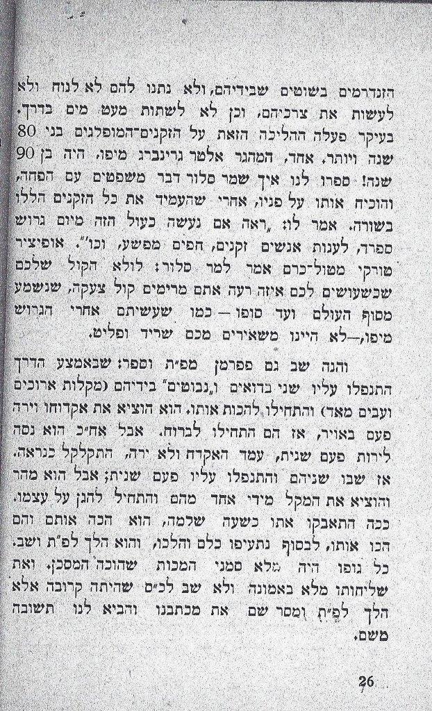 הז'נדרמים בשוטים שבידיהם, ולא נתנו להם לא לנוח ולא לעשות את צרכיהם, וכן לא לשתות מעט מים בדרך. בעיקר פעלה ההליכה הזאת על הזקנים-המופלגים בני 80 שנה ויותר. אחד, המהגר אלטר גרינברג מיפו, היה בן 90 שנה! סרו לנו איך שמר סלור דבר משפטים עם הפחה, והוכיח אותו על פניו, אחרי שהעמיד את כל הזקנים הללו בשורה. אמר לו: ראה אם נעשה כעול הזה מיום גרוש ספרד, לענות אנשים זקנים, חפים מפשע, וכו''. אופיציר טורקי מטול-כרם אמר למר סלור: לולא הקול שלכם שכשעושים לכם איזה רעה אתם מרימים קול צעקה, שנשמע מסוף העולם ועד סופו - כמו עשיתם אחרי הגרוש מיפו, - לא היינו משאירים מכם שריד ופליט. והנה שב גם פפרמן מפ''ת וספר: שבאמצע הדרך התנפלו עליו שני בדאוים ו''נבוטים'' בידיהם (מקלות ארוכים ועבים מאד) והתחילו להכות אותו. הוא הוציא את אקדוחו וירה פעם באויר, אז הם התחילו לברוח. אבל אח''כ הוא נסה לירות פעם שנית, עמד האקדח ולא ירה, התקלקל כנראה. אז שבו שניהם והתנפלו עליו פעם שנית: אבל הוא מהר והוציא את המקל מידי אחד מהם והתחיל להגן על עצמו. ככה התאבקו אתו כשעה שלמה, הוא הכהאותם והם הכו אותו, לבסוף נתעיפו כלם והלכו, והוא הלך לפ''ת ושב. כל גופו היה מלא סמני המכות שהוכו המסכן. ואת שליחותו מלא באמונה ולא שב לכ''ס שהיתה קרובה אלא הלך לפ''ת ומסר שם את מכתבנו והביא לנו תשובה משם. 26