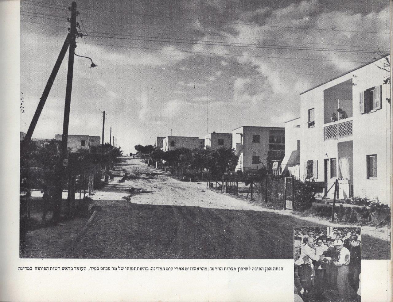 הנחת אבן הפינה לשיכון חצרות הדר א', מהראשונים אחרי קום המדינה, בהשתתפותו של מר פנחס ספיר, העומד בראש רשות הפיתוח במדינה.