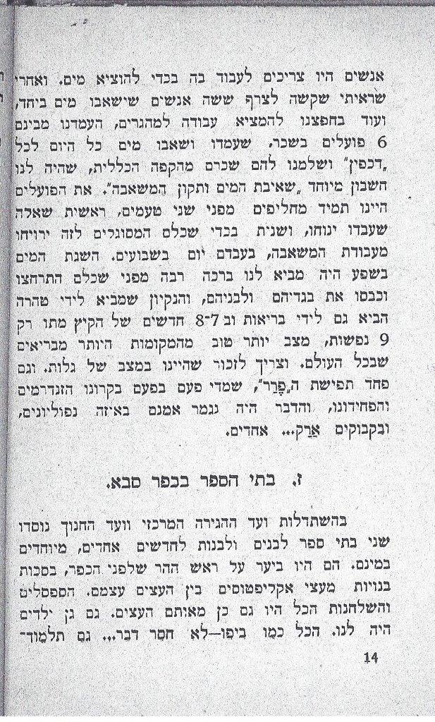 אנשים היו צריכים לעבוד בה בכדי להוציא מים. ואחרי שראיתי שקשה לצרף ששה אנשים שישאבו מים ביחד, ועוד בחפצנו להמציא עבודה למהגרים, העמדנו מבינם 6 פועלים בשכר, שעמדו ושאבו מים כל היום לכל''דחפין'' ושלמנו להם שכרם מהקופה הכללית, שהיה לנו חשבון מיוחד ''שאיבת המים ותקון המשאבה''. את הפועלים היינו תמיד מחליפים מפני שני טעמים, ראשית שאלה שעבדו ינוחו, ושנית בכדי שכולם המסוגלים לזה ירויחו מעבודת המשאבה, בעבדם יום בשבועים. השגת המים בשפע היה מביא לנו ברכה רבה מפני שכולם התרחצו וכבסו את בגדיהם, והנקיון שמביא לידי טהרה הביא גם לידי בריאות וב-8-7 חודשים של הקיץ מתו רק 9 נפשות, מצב יותר טוב מהמקומות היותר מבראיאים שבכל העולם. וצריך לזכור שהיינו במצב של גלות. וגם פחד תפישת ה''פרר'', שמדי פעם בפעם בקורנו הז'נדרמים והפחידונו, והדבר היה נגמר אמנם באיזה נפוליונים, ובקבוקים ארק... אחדים.ז. בתי הספר בכפר-סבאבהשתדלות ועד ההגירה המרכזי וועד החנוך נוסדו שני בתי ספר לבנים ולבנות לחדשים אחדים, מיוחדים במינם. הם היו ביער על ראש ההר שלפני הכפר, בסוכות בנויות מעצי אקליפטוסים בין העצים עצמם. גם גן ילדים היה לנו. הכל כמו ביפו - לא חסר דבר... גם תלמוד14
