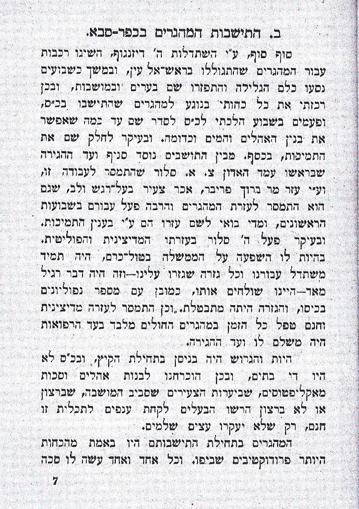 ב. התישבות המהגרים בכפר-סבאסוף סוף, ע''י השתדלות ה' דיזנגוף, השיגו רכבות עבור המהגרים שהתגוללו בראש אל עין, ובמשך כשבועים נסעו כלם הגלילה והתפזרו שם בערים ובמושבות, ובכן רכזתי את כל כחותי בנוגע למהגרים שהתיישבו בכ''ס, ופעמים בשבוע הלכתי לכ''ס לסדר שם עד כמה שאפשר את בנין האהלים והמים וכדומה.ובעיקר לחלק שם את התמיכות, בכסף. מבין התושבים נוסד סניף ועד ההגירה שבראשו עמד האדון צ. א. סלור שהתמסר לעבודה זו, וע''י עזר מר ברוך פריבר, אכר צעיר בעל-רגש ולב, שגם הוא התמסר לעזרת המהגרים והרבה פעל עבורם בשבועות הראשונים, ומדי בואי לשם עזרו הם ע''י בענין התמיכות. ובעיקר פעל ה' סלור בעזרתו המדיצינית והפוליטית. בהיות לו השפעה על הממשלה בטול-כרם, היה תמיד משתדל עבורנו וכל גזרה שגזרו עלינו - וזה היה דבר רגיל מאד - היינו שולחים אותו, כמובן עם מספר נפוליונים בכיסו, והגזרה היתה מתבטלת. וכן התמסר לעזרה מדיצינית וחנם טפל כל הזמן במהגרים החולים מלבד בעד הרפואות היה משלם לו ועד ההגירה.היות והגרוש היה בניסן בתחילת הקיץ, ובכ''ס לא היו די בתים, ובכן הוכרחנו לבנות אהלים וסכות מאקליפטוסים, שביערות הצעירים שסביב המושבה, שברצון או לא ברצון הרשו הבעלים לקחת ענפים לתכלית זו חנם, רק שלא יעקרו עצים שלמים. המהגרים בתחילת התישבותם היו באמת מהכחות היותר פרודוקטיבים שביפו. וכל אחד ואחד עשה לו סכה |