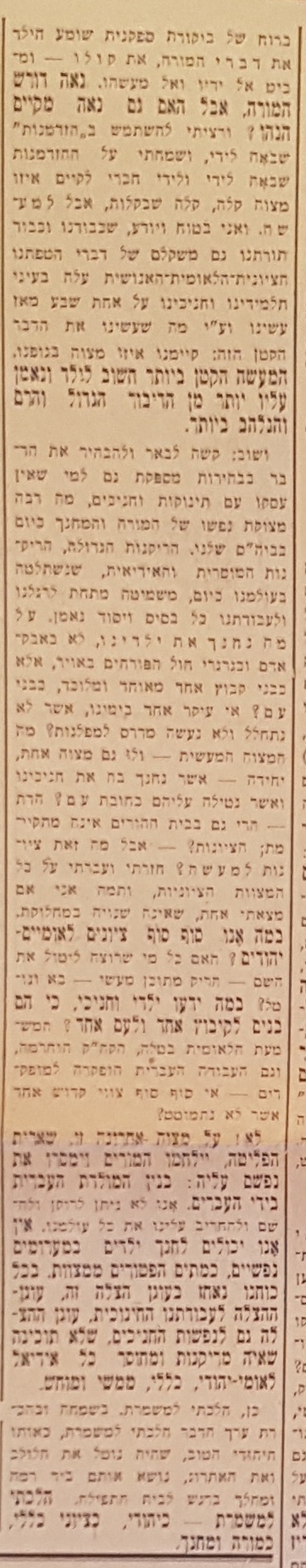 לא! על מצוה אחרונה זו, שארית הפליטה, יילחמו המורים וימסרו את נפשם עליה: בנין המולדת העברית בידי העברים. אנו לא ניתן לרוקן ולהשם ולהחריב עלינו את כל עולמנוץ אין אנו יכולים לחנך ילדים במערומים נפשיים, כמתים הפטורים ממצוות. בכל כוחנו נאחז בעוגן הצלה זה, עוגן--ההצלה לעבודתנו החינוכית, עוגן ההצלה גם לנפשות החניכים, שלא תוכינה שאיה מריקנות ומחוסר כל אידיאל לאומי-יהודי, כללי, ממשי ומוחש.
